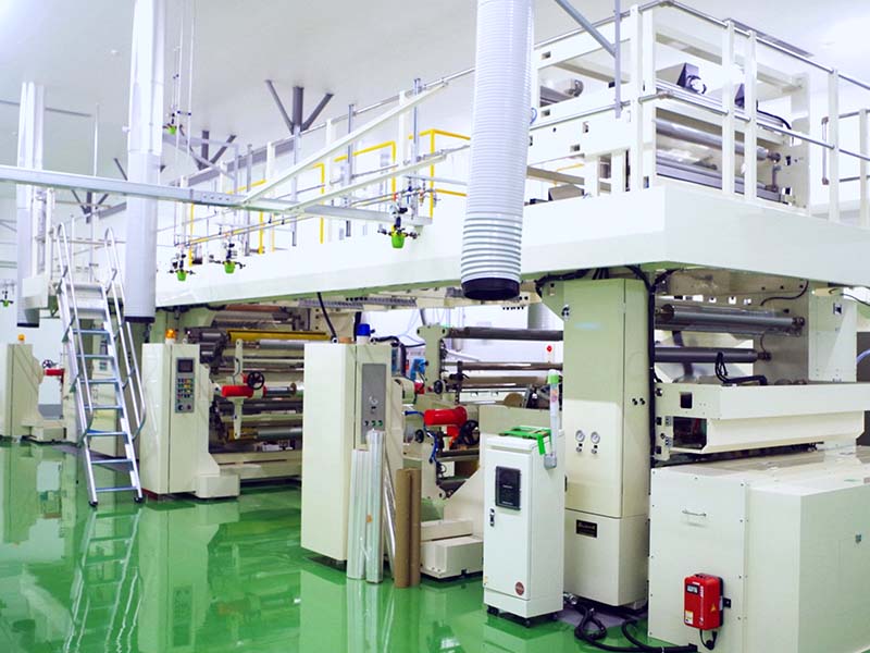 ラミネート工程では印刷したフィルムに多様な性質を持ったフィルムを貼り合わせます。これにより包材の強度を向上させると同時にお客様のご要望や内容物に応じて、遮光性を持つフィルムや湿気及び酸素バリア効果を持つフィルムを貼り合わせる事で、食品の長期保存を可能とします。