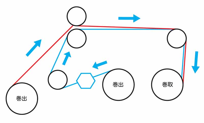 接着剤を温度調整可能なロールで液温を高くし粘性を下げフィルムに転移させます。溶剤は使用せず、温度変化により粘性をコントロールします。溶剤を使用しない為、乾燥ゾーンを必要とせず第二基材のフィルムを貼り合わせます。