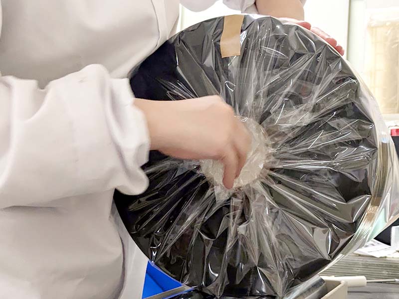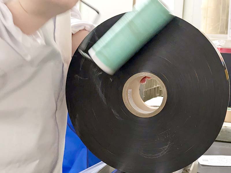 スリットした巻取の外観確認やコロがけをおこない、OPPフィルムなどで梱包し、製品ラベルを貼付梱包して仕上げます。