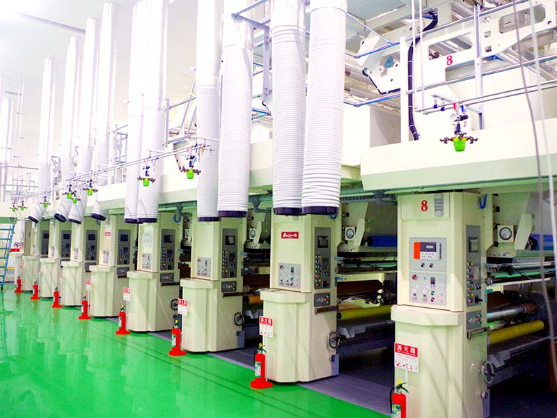 接着剤を溶剤で希釈し印刷フィルムに転移させます。乾燥ゾーンで溶剤だけを乾燥させた後、機能性を持った第二基材のフィルムを貼り合わせます。