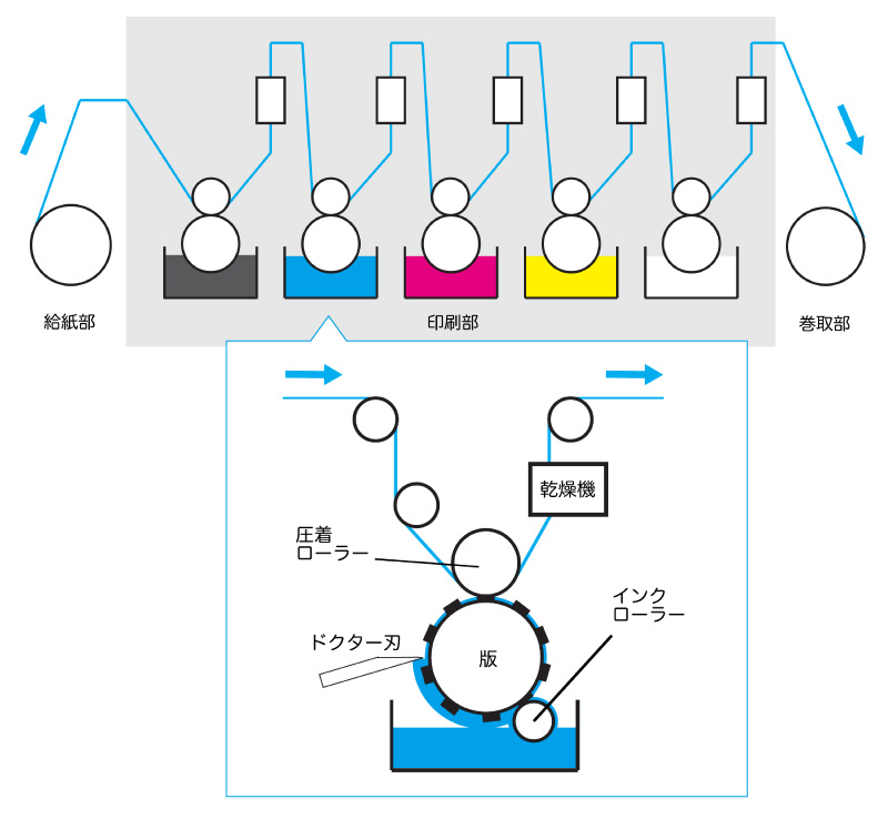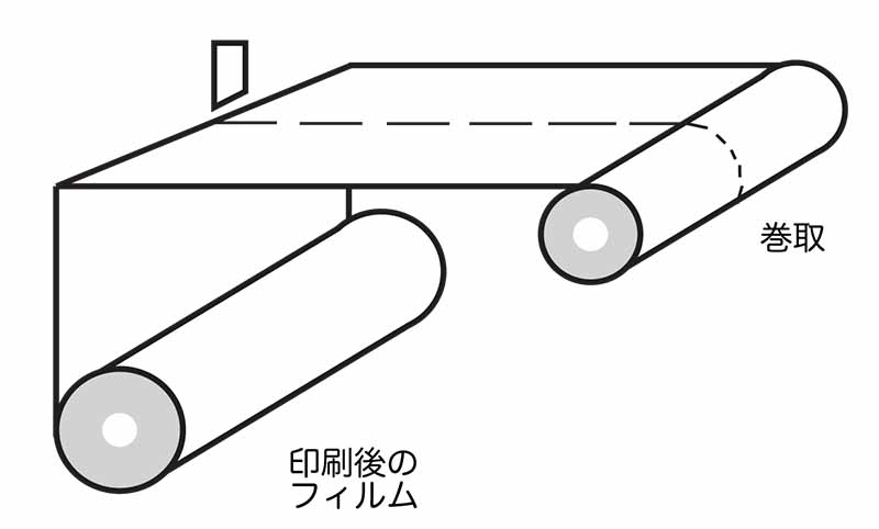 - フィルムに転移したインクは乾燥機で温風により乾燥され、色数に応じて、次のユニットで他の色を転移させる事を繰り返し、複数色の印刷を構成します。