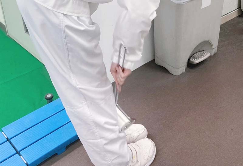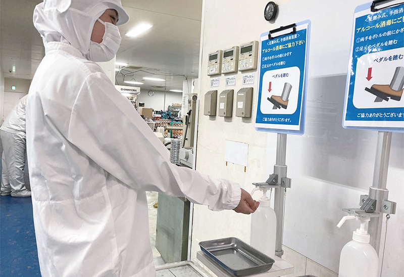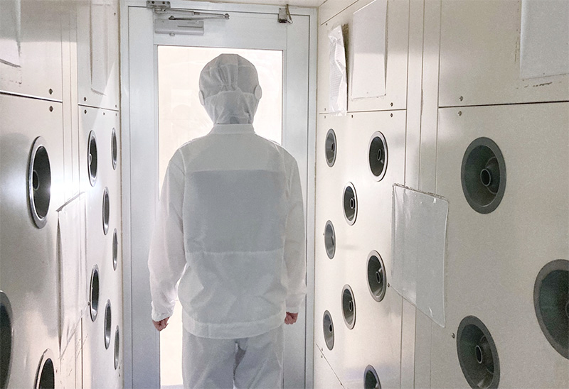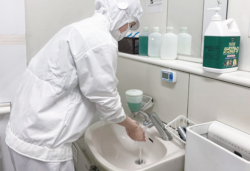 工場に入る前には、粘着クリーナーで衣類の埃を取り、30秒以上の手洗いを行った後、エアーシャワーで全身の汚れを取り、工場入口で手の消毒を行っております。食品工場と同等の徹底した管理により、お客様へ安定した品質の製品をお届けしております。