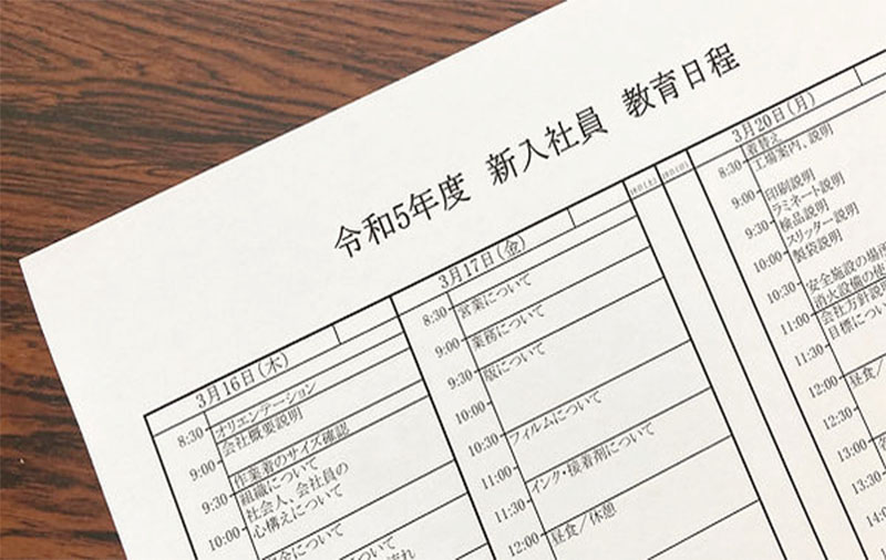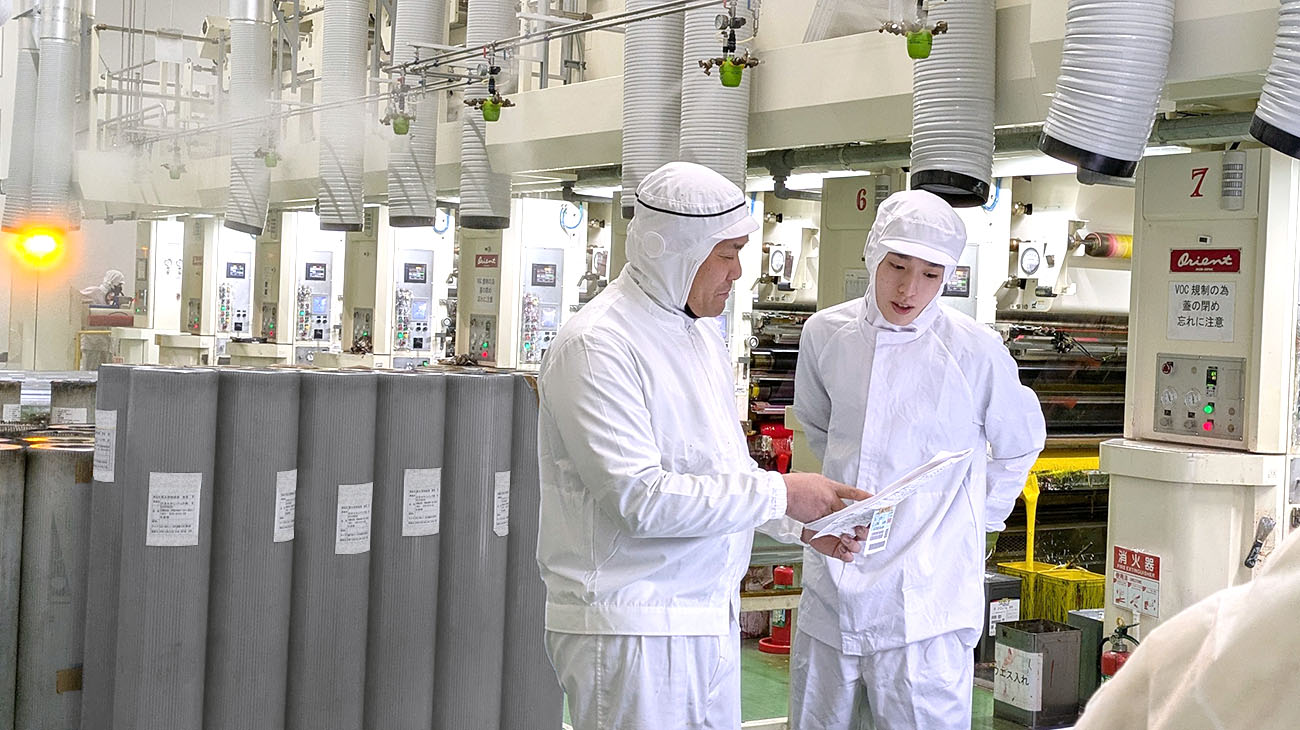 新潟工場に入社された方は、工場内で3日間研修を行います。グラビア印刷についての知識、工場内でのルールなどを学んでいただきます。研修終了後、配属先の先輩と一緒に仕事をします。仕事に慣れてきたら3組2交替の勤務になります。