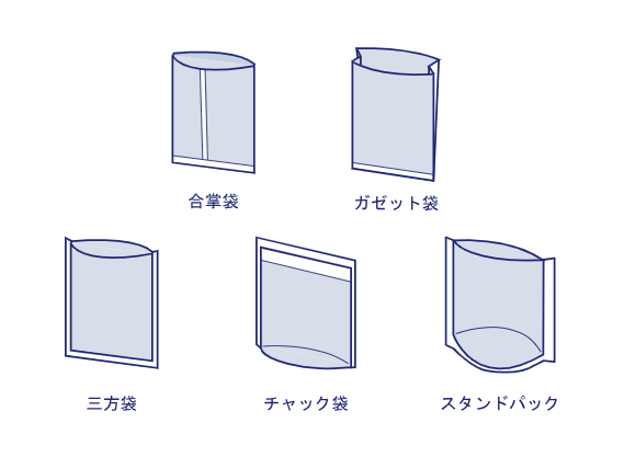 合掌袋の他にも、三方袋、ガジェット袋など、あらゆる種類の袋があります。これらも袋の中に入れるものが零れ落ちないように、様々な方法と形で熱を加えて、密閉可能な形に作り上げています。以下の図は、真丸特殊紙業が製造可能な袋の形です。