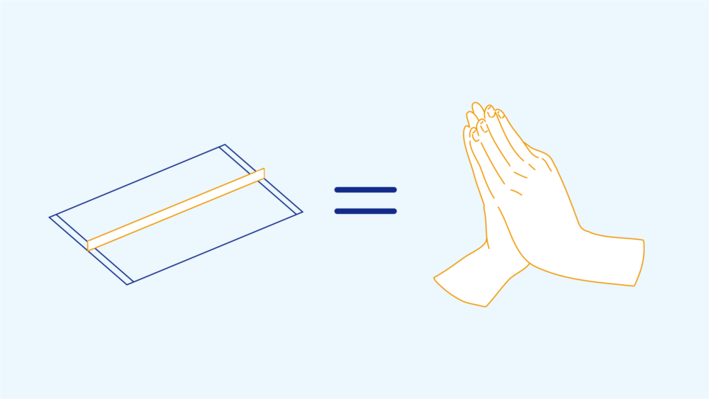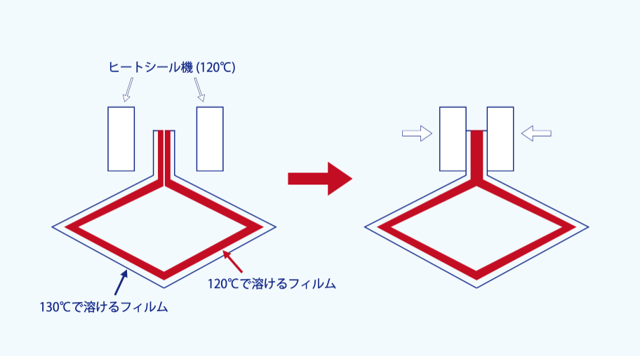 上の図は、合掌袋を開いて上から見た様子です。外側のプラスチックフィルムと内側のプラスチックフィルムを重ねて、突起部分にヒートシール機で熱を加えます。すると、内側のプラスチックフィルムだけが熱で溶けて交わります。これは、内側のプラスチックフィルムの方が耐熱温度が低いからです。外側に耐熱温度の強いプラスチックフィルムを持ってくることで、内側だけが溶けて糊付けの役割を果たします。こうして、密閉された袋を作ることができるのです。