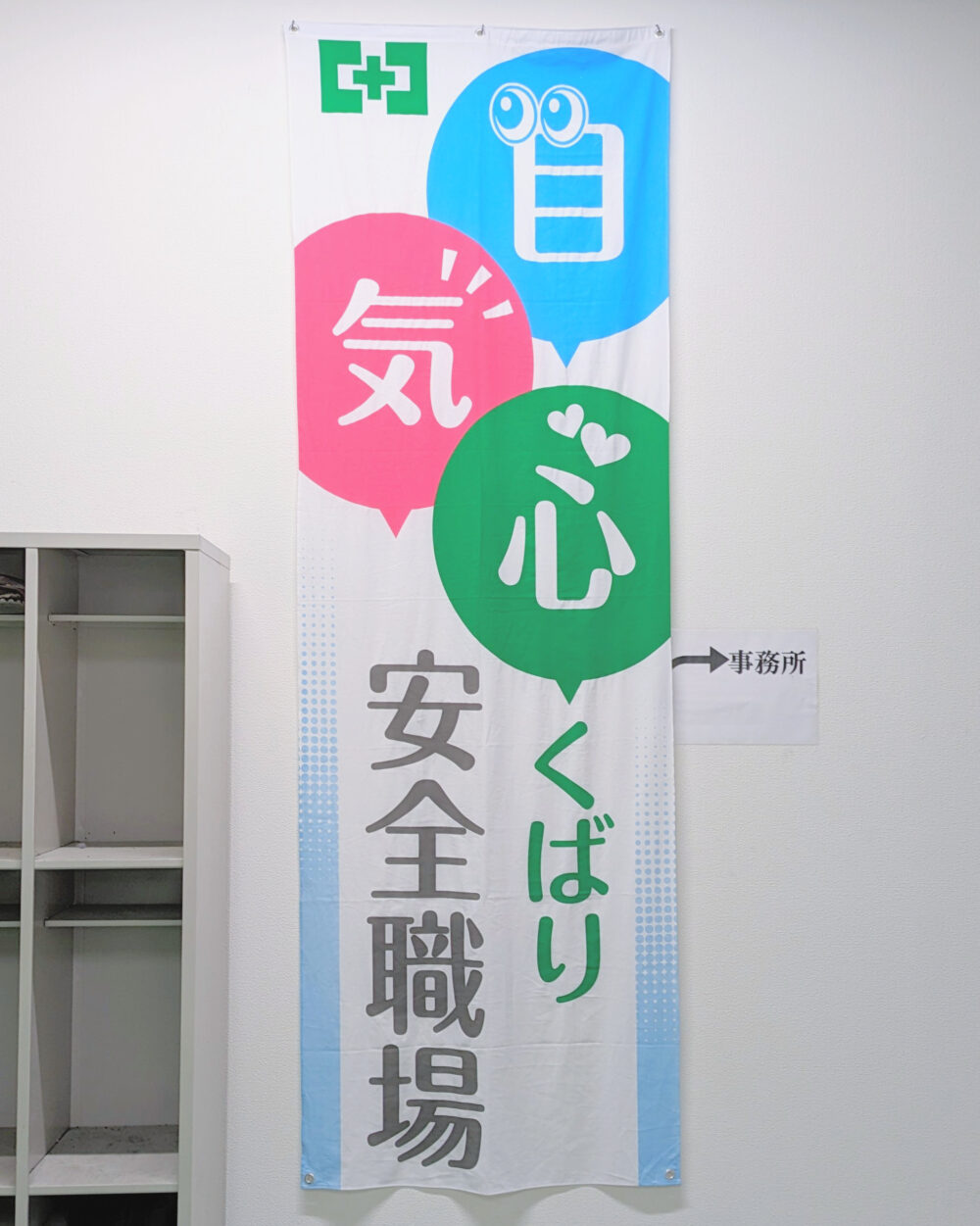 一方、いつの間にか新しくなっていた垂れ幕の内容は「目・気・心くばり 安全職場」。目配り気配り心配りによって安全な職場にしようということでしょうか。