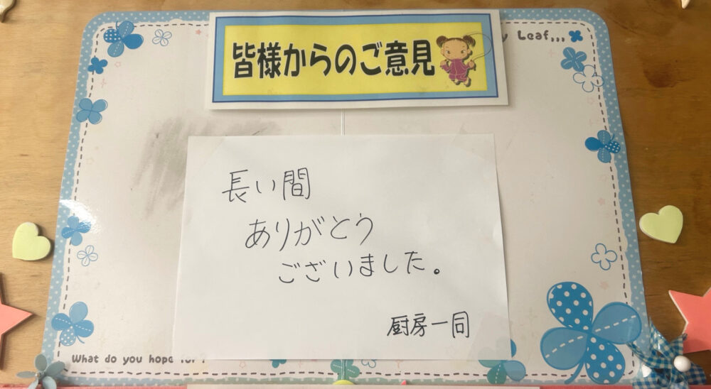 最後の日には「長い間ありがとうございました」といったお言葉が添えられていました。
