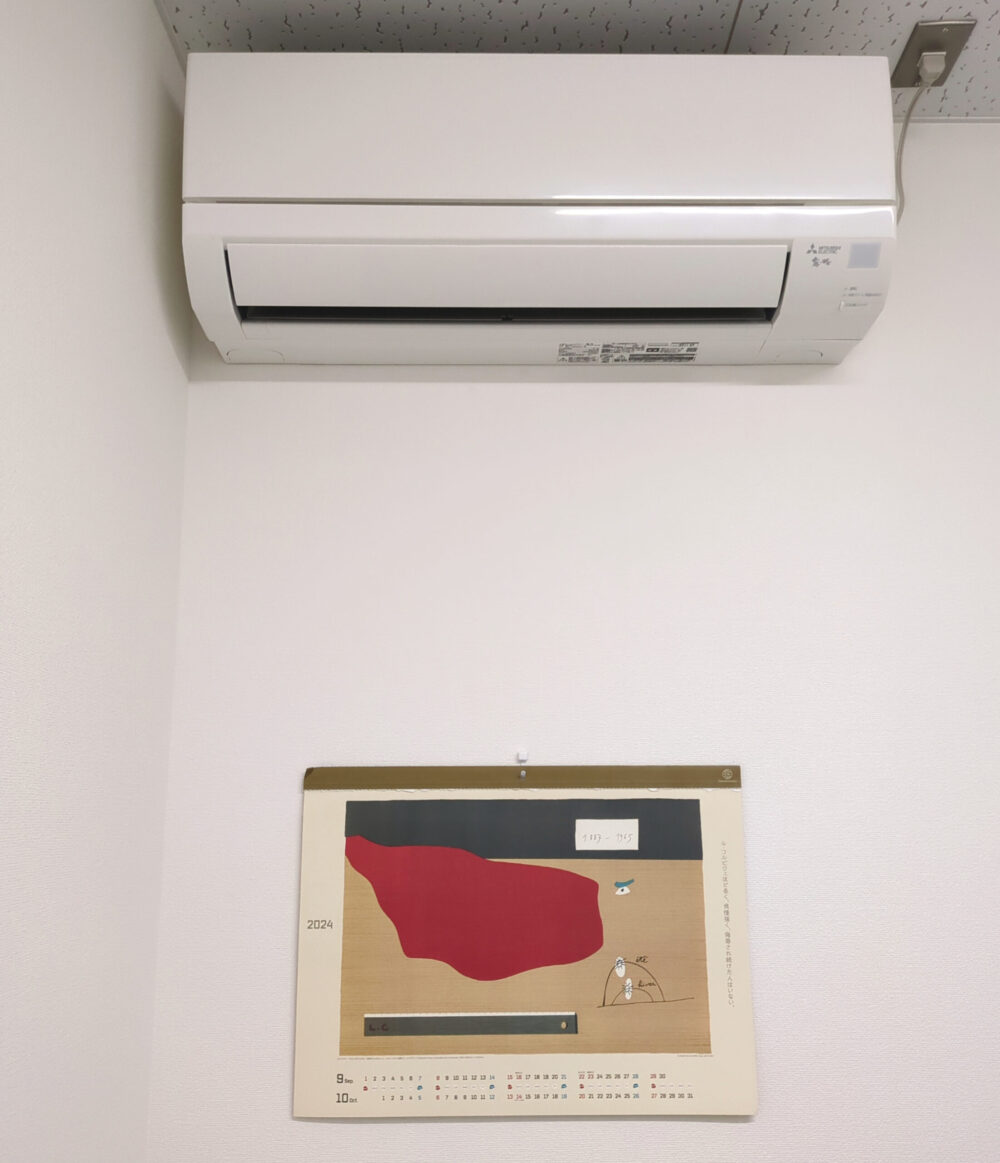 床にはタイルマットを敷き詰めローテーブルと座布団を設置、壁にはお洒落そうなカレンダーを掛けてみました。大体5人程が足を伸ばせる広さです。エアコンも新しいものになりましたよ。