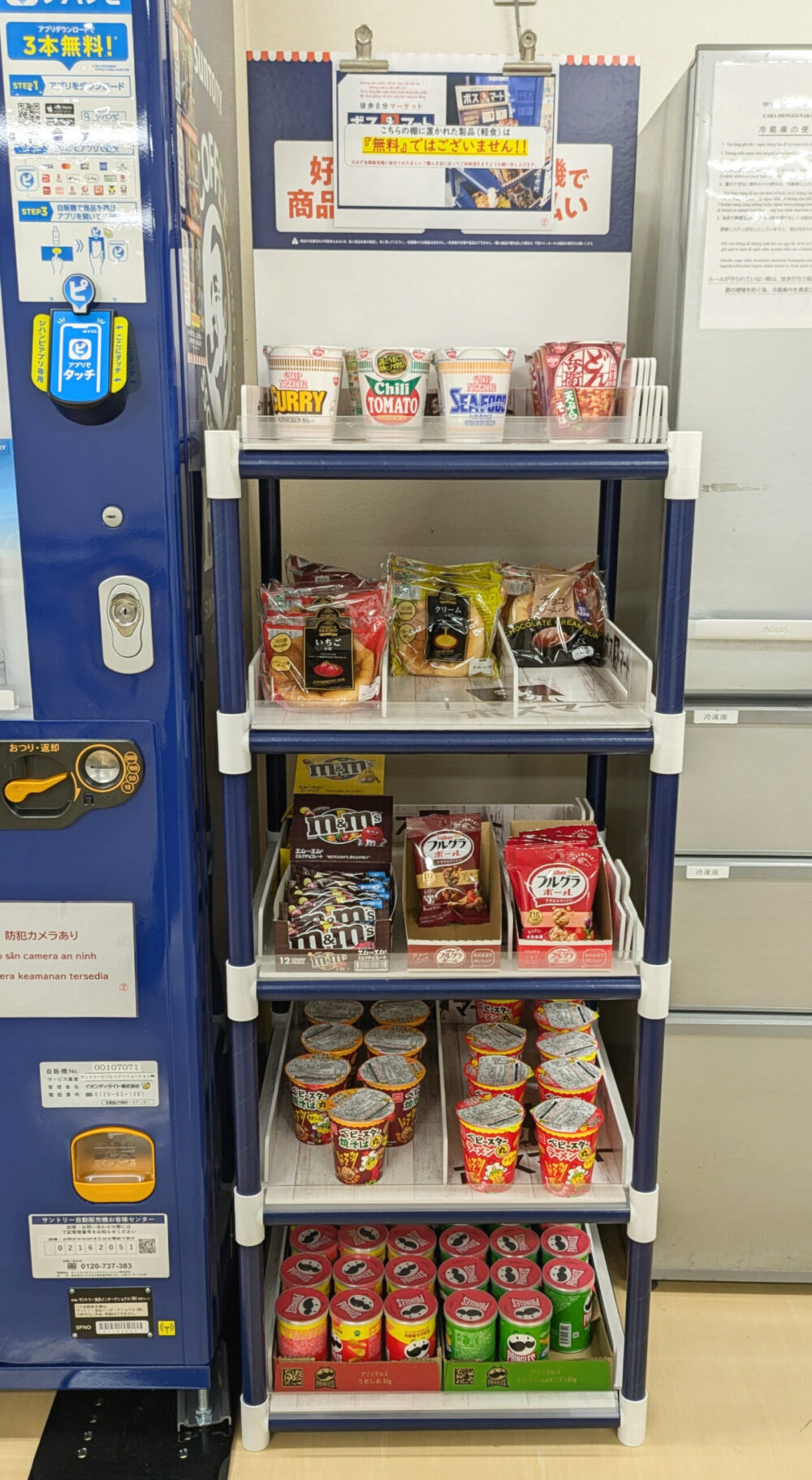 食堂が稼働していた頃は、夜勤の従業員向けに夜食が用意されていましたが、食堂委託の契約を終了してからは夜食が無くなりました。また、買いに行こうにもコンビニは一番近くて徒歩30分以上です。これでは夜勤の方は勿論、お昼時でも食事を忘れたら食べるものが無い状態です。そこで、気軽に購入可能な無人売店が設置されました。