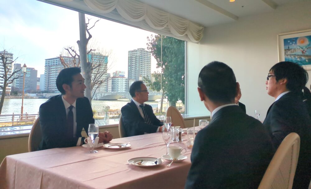 ↑窓側2名の男性が真丸、向かい側が内定者の方々です。